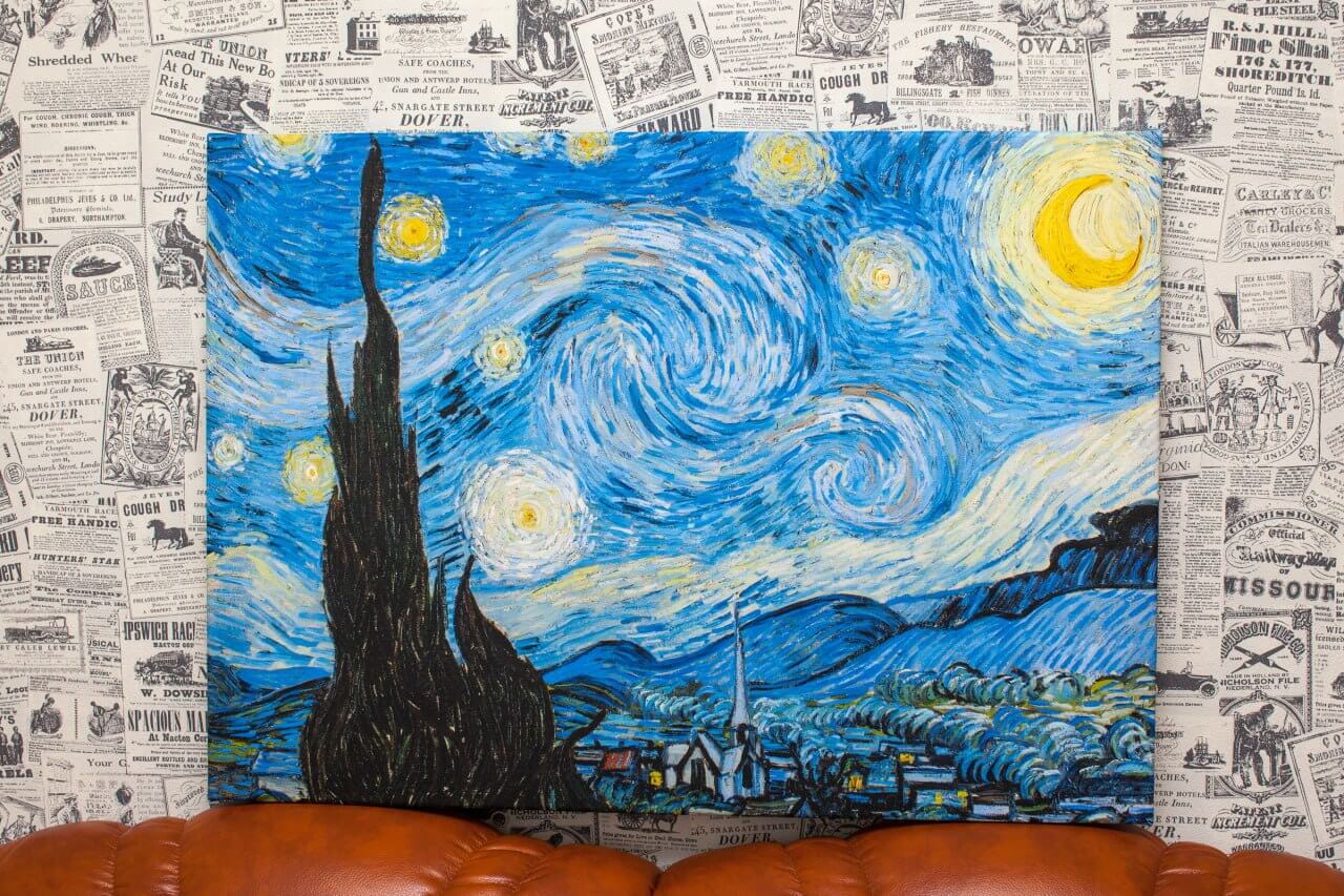 Высококачественная репродукция знаменитой картины Винсента Ван Гога «Звёздная ночь», выполненная методом профессиональной печати на натуральном холсте. Изображение отличается высокой детализацией, глубиной цвета и выразительной фактурой, передающей характер живописного оригинала.